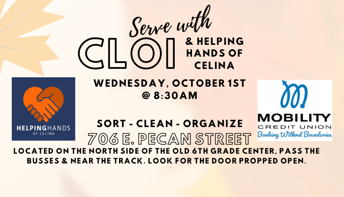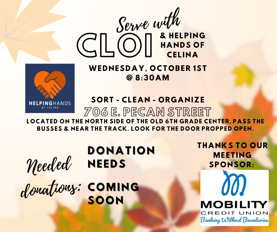 Mark your calendar for Tuesday, October 1 at 8:30 a.m. as we gather for our annual CLOI Serve Day with Helping Hands of Celina. We’ll be sorting, organizing, and lending a hand wherever needed to support their amazing work in our community.