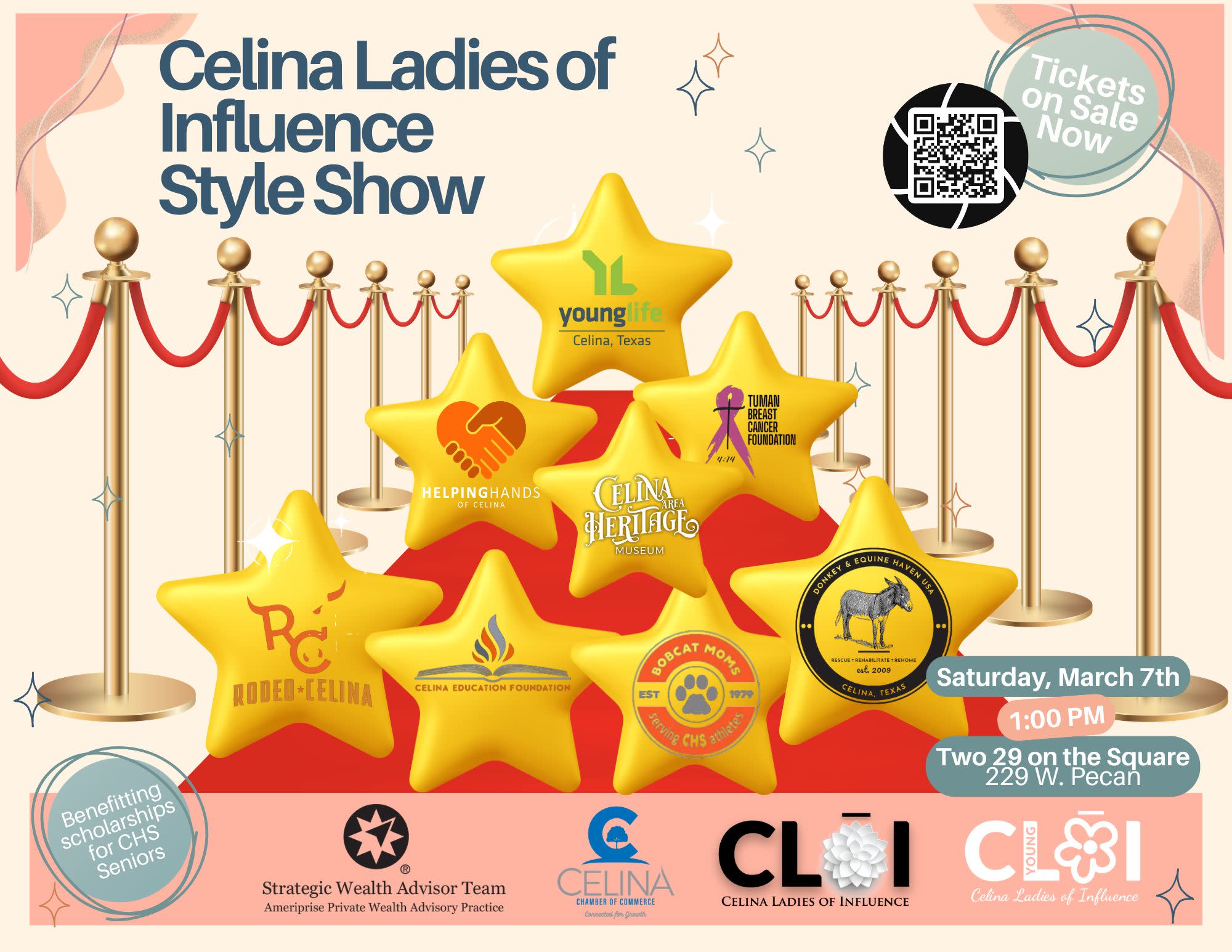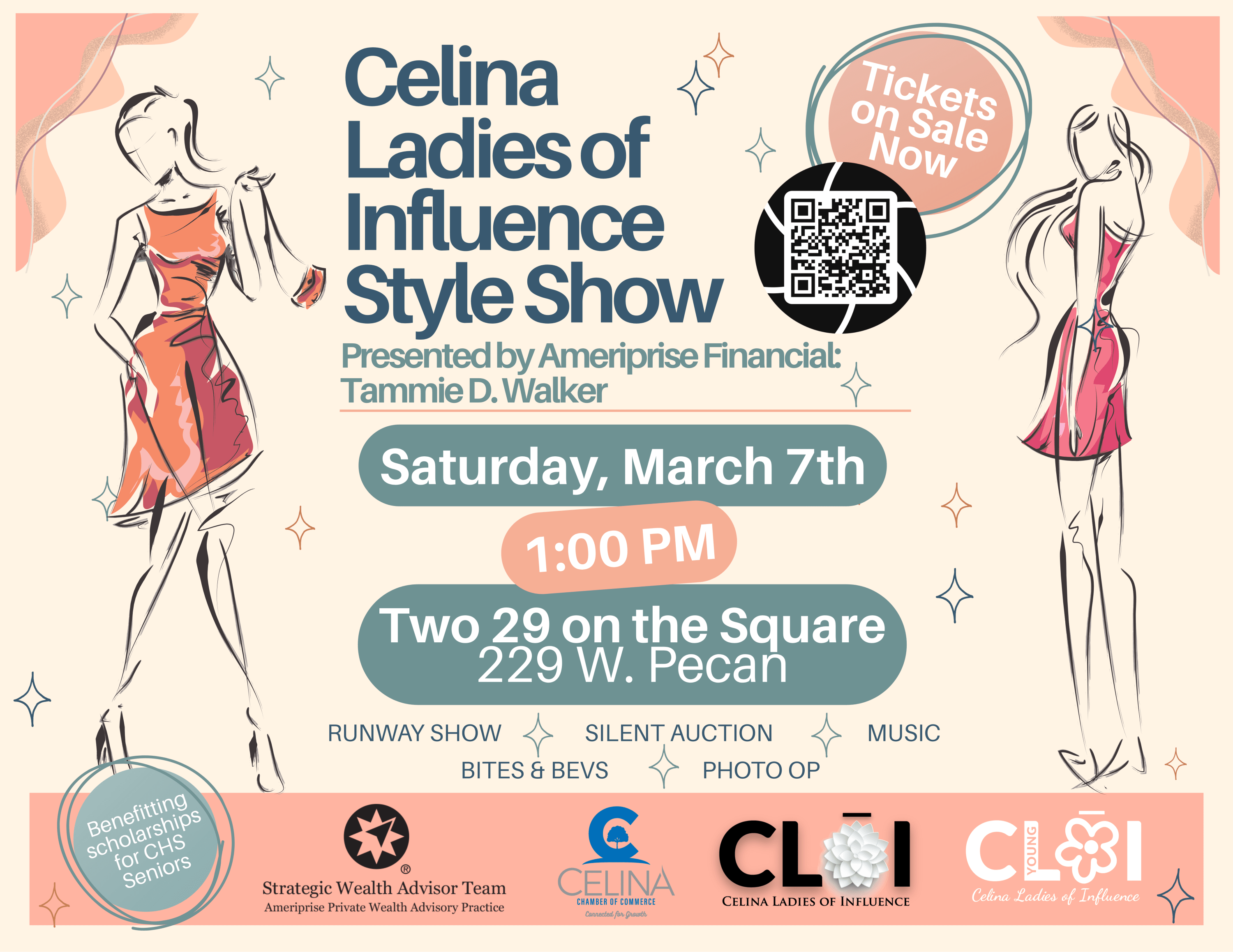 Your $30 ticket includes lite bites, a welcome cocktail as well as your choice of white wine or prosecco, access to the silent auction, raffles and of course the runway show featuring our amazing Downtown Celina businesses. Proceeds benefit scholarships for CHS Seniors.